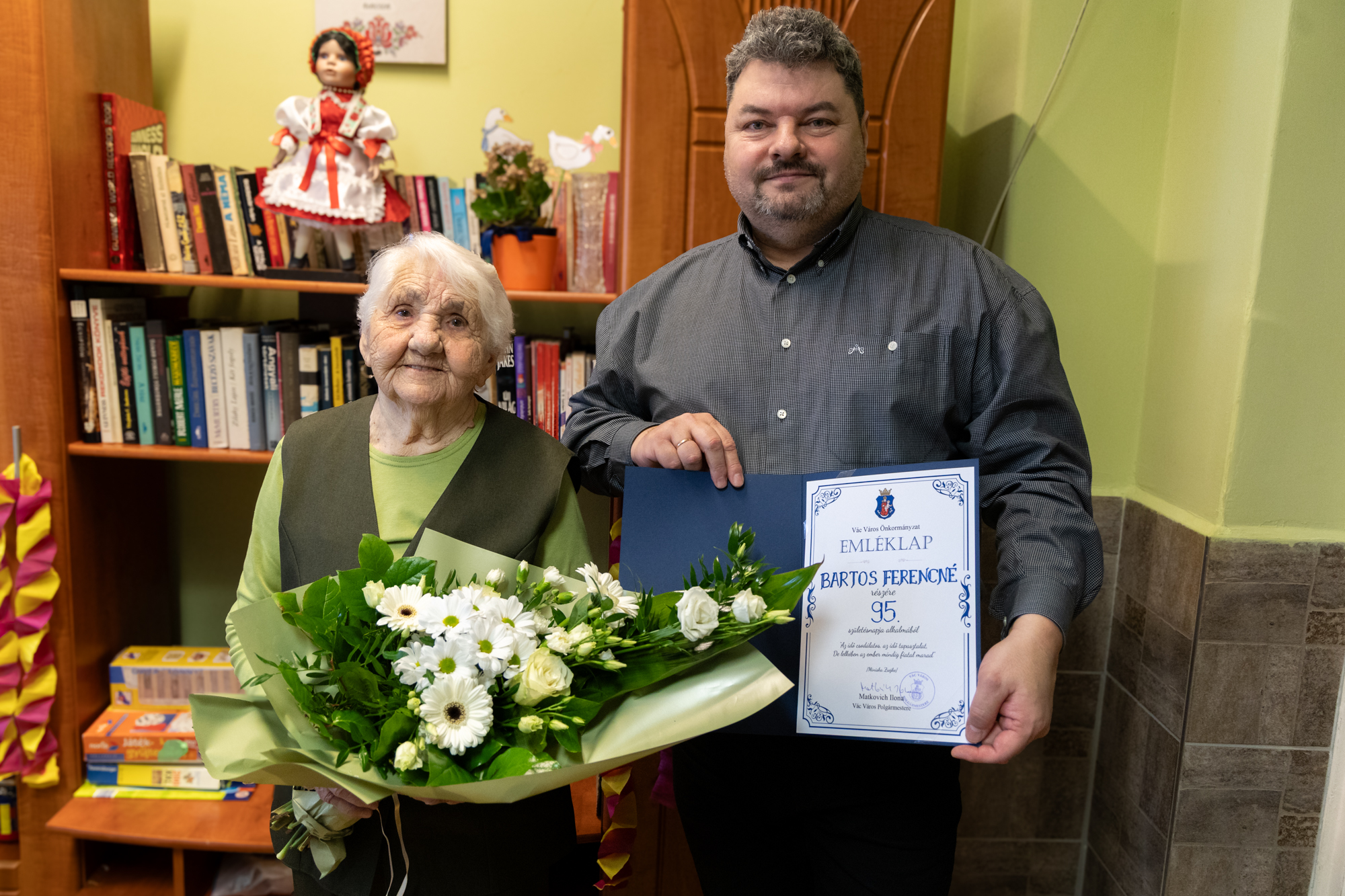 Bartos Ferencnét 95. születésnapja alkalmából az önkormányzat nevében Inotay Gergely alpolgármester köszöntötte.
