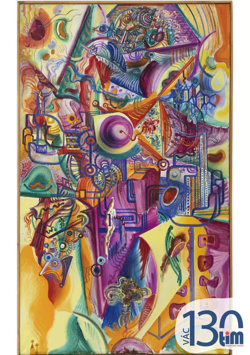 • A páratlan gyűjteményből most egy kései, összefoglaló korszakból származó festményt mutatunk be, amely egyúttal jól tükrözi a teoretikus művészeti írásokat is közreadó Hincz elgondolását, miszerint a művészet képes a létezés alapstruktúráit feltárni és világra vonatkozó ismereteinket összegezni. A világanatómia című művében, ennek a szintézisre törekvő látásmódnak egyik beszédes példáját látjuk, ahol az emberi test bonyolult anatómiai valósága, és a világegyetem atomizált részecskéi egyetlen monumentális térben sűrűsödnek össze, mintha a mikro- és makrokozmosz egyesülésének lennénk tanúi. A dinamikus kompozícióban – Hinczre jellemző módon – a geometrikus és a biomorf formák együttesen vannak jelen, miközben játékos párbeszédbe lépnek egymással, létrehozva egy olyan különleges, vizionárius dimenziót, amelyben a mechanikus szerkezeti elemek és az archaikus szimbólumok (szem, virág, kör) egy közös struktúrában élednek újjá. Ezt a dekoratív, élénk színekben vibráló absztraháló stílusvilágot, amely a 20. századi európai izmusok egyedi szintéziséből született, Hincz találóan „amőbaizmusnak” nevezte el.