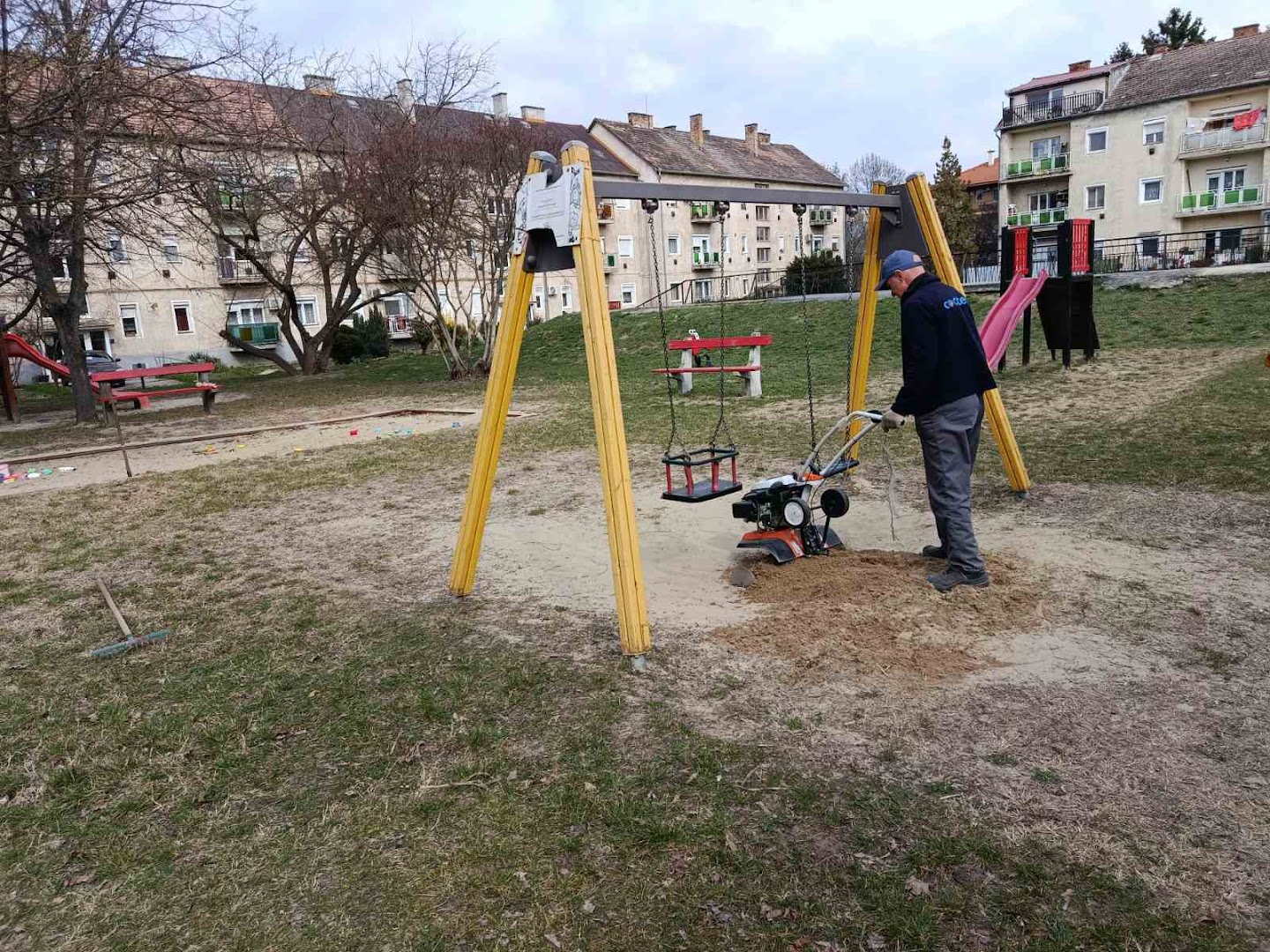 Játszóterek esési felületek és homokzók fellazítása, homokcseréje: “Hekli” és “kishekli” parkok, Sirály utca “üveges” udvar, Damjanich utcai “hajós” játszótér, Virág utca, Rákóczi tér, Kőhíd lakótelep