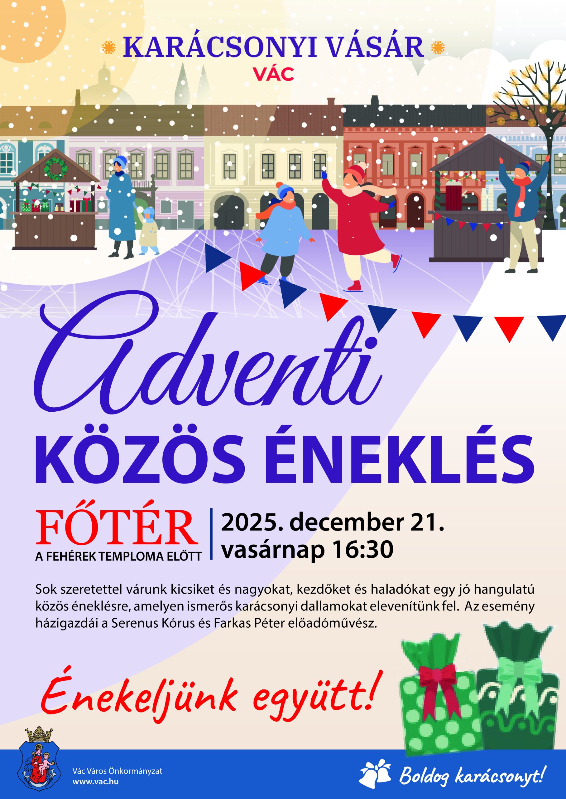 Sok szeretettel várunk kicsiket és nagyokat, kezdőket és haladókat egy jó hangulatú közös éneklésre, amelyen ismerős karácsonyi dallamokat elevenítünk fel. Az esemény házigazdái a Serenus Kórus és Farkas Péter előadóművész.