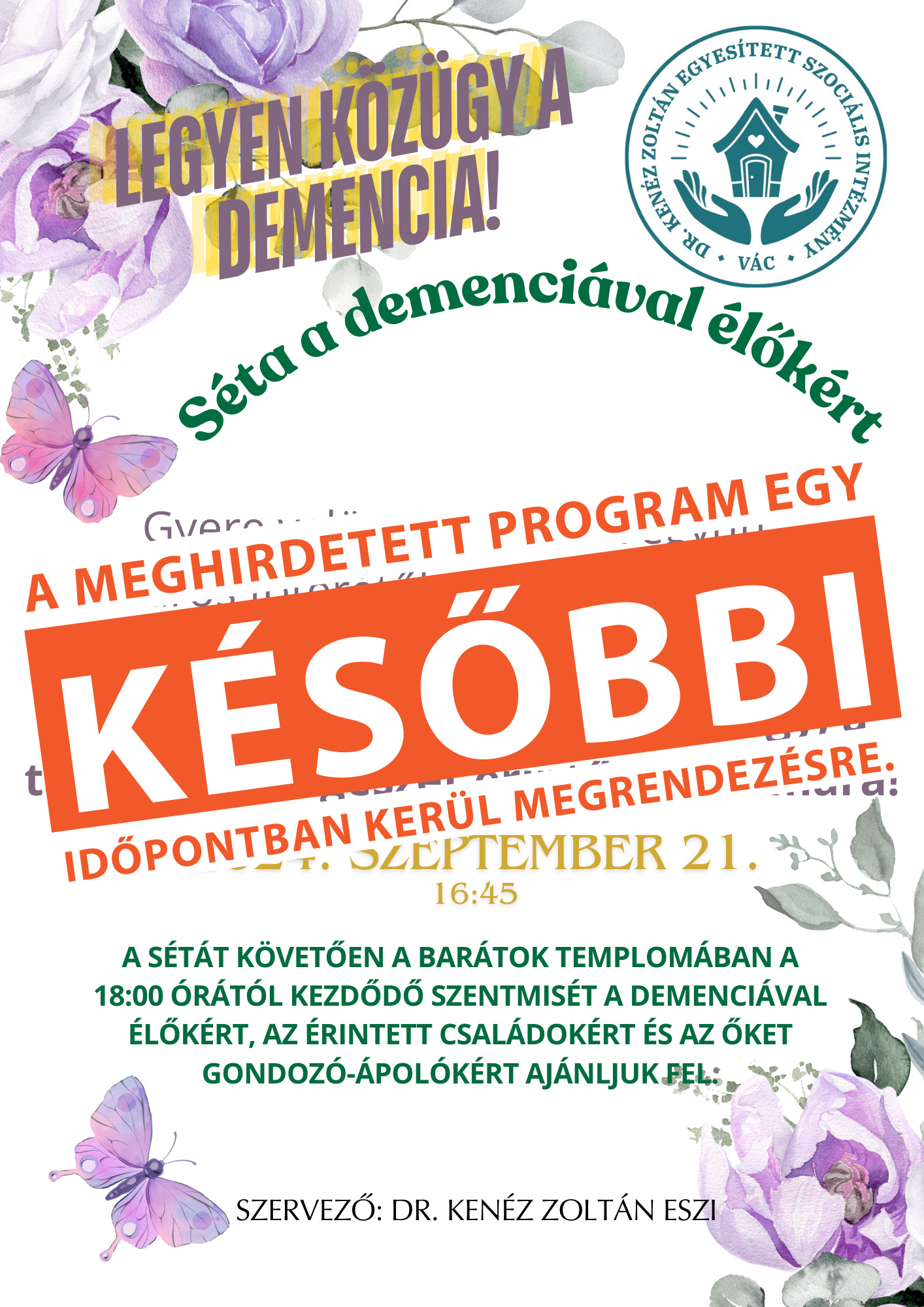 A Dr. Kenéz Zoltán Egyesített Szociális Intézmény sétája, amelyet eredetileg 2024. szeptember 21. szombatra terveztek, az árvízvédelmi feladatok miatt elmarad és egy későbbi időpontban kerül megrendezésre – írja Vác város önkormányzatának honlapja.