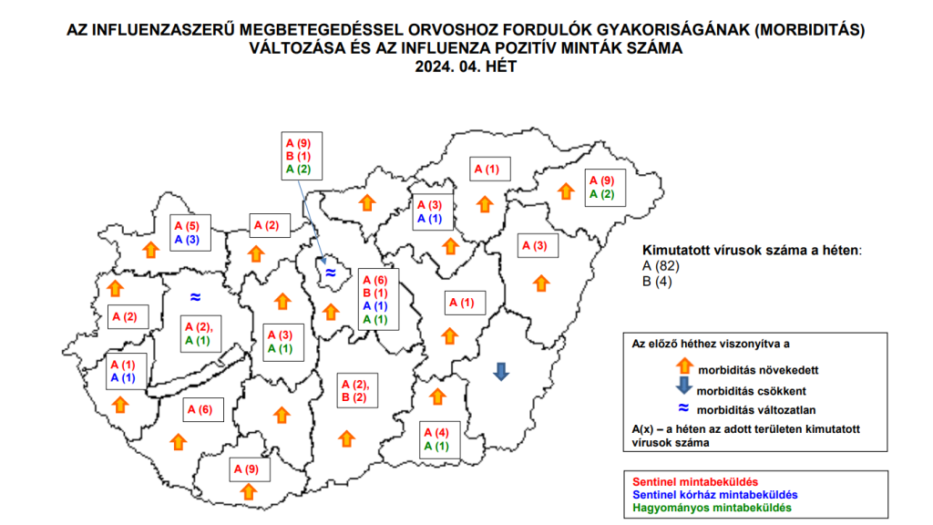 2024. év negyedik hetében 17 közigazgatási területen nőtt, egy területen csökkent és két területen nem változott az influenzás tünetekkel orvoshoz fordulók gyakorisága az előző héthez viszonyítva. A 100 000 lakosra jutó orvoshoz fordult betegek száma Szabolcs-Szatmár-Bereg (693), Győr-Moson-Sopron (667) és Zala (666) vármegyében volt a legmagasabb, Heves (153), Békés (153) és Csongrád-Csanád (203) vármegyében a legalacsonyabb. Laboratóriumi vizsgálattal igazolt, influenzavírus által okozott megbetegedéseket három vármegye kivételével (Békés, Nógrád és Tolna) valamennyi területen diagnosztizáltak.