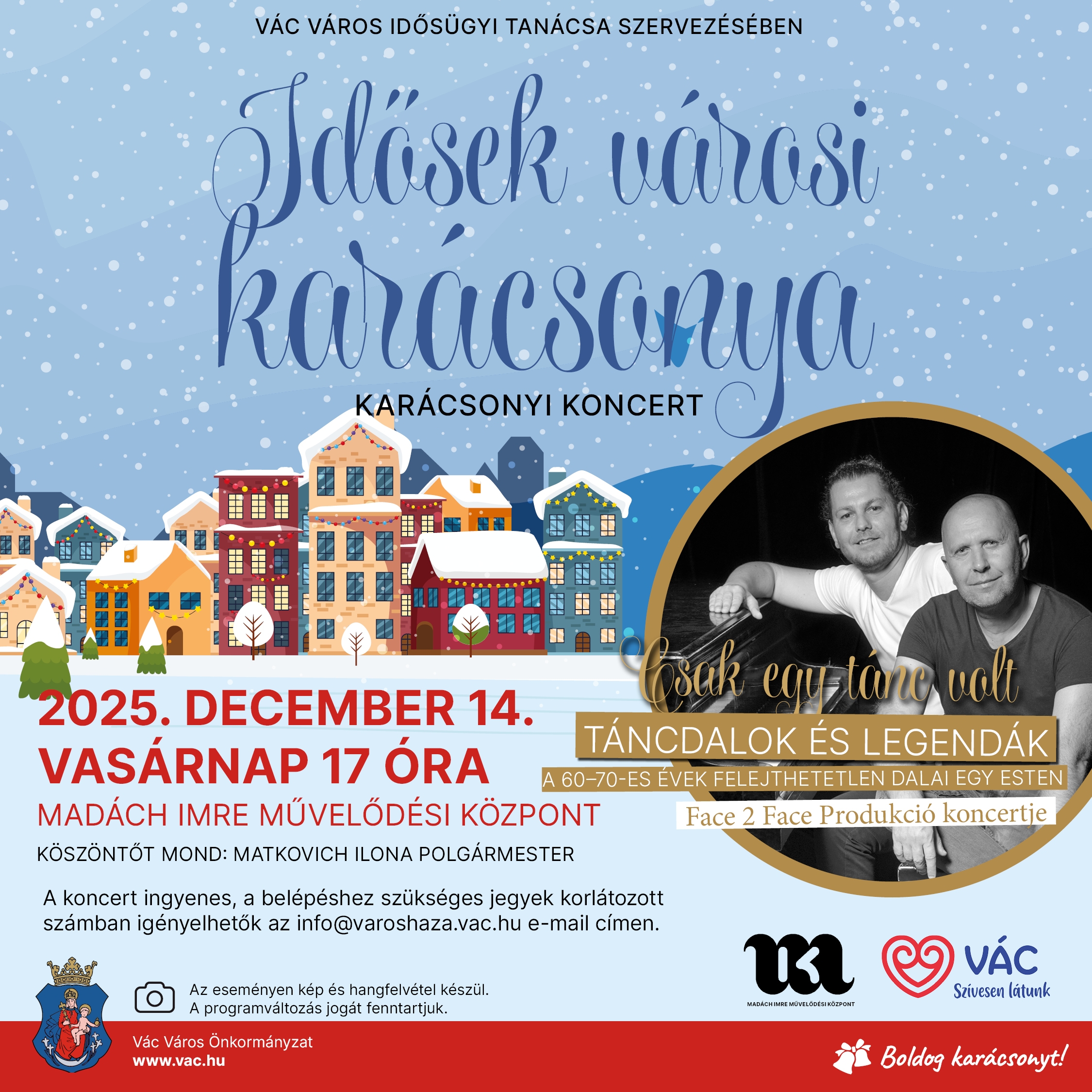 Vác Város Önkormányzat tisztelettel és szeretettel meghívja idős lakosait az „Idősek városi karácsonya” című programra, amelyen a tavalyi, nagy sikerű Máté Péter-est után a Face 2 Face Produkció „Csak egy tánc volt – táncdalok és legendák” című előadását láthatják a résztvevők. A magyar könnyűzene aranykorának hangulatát idézik meg a 60–70-es évek felejthetetlen slágereivel az est folyamán.