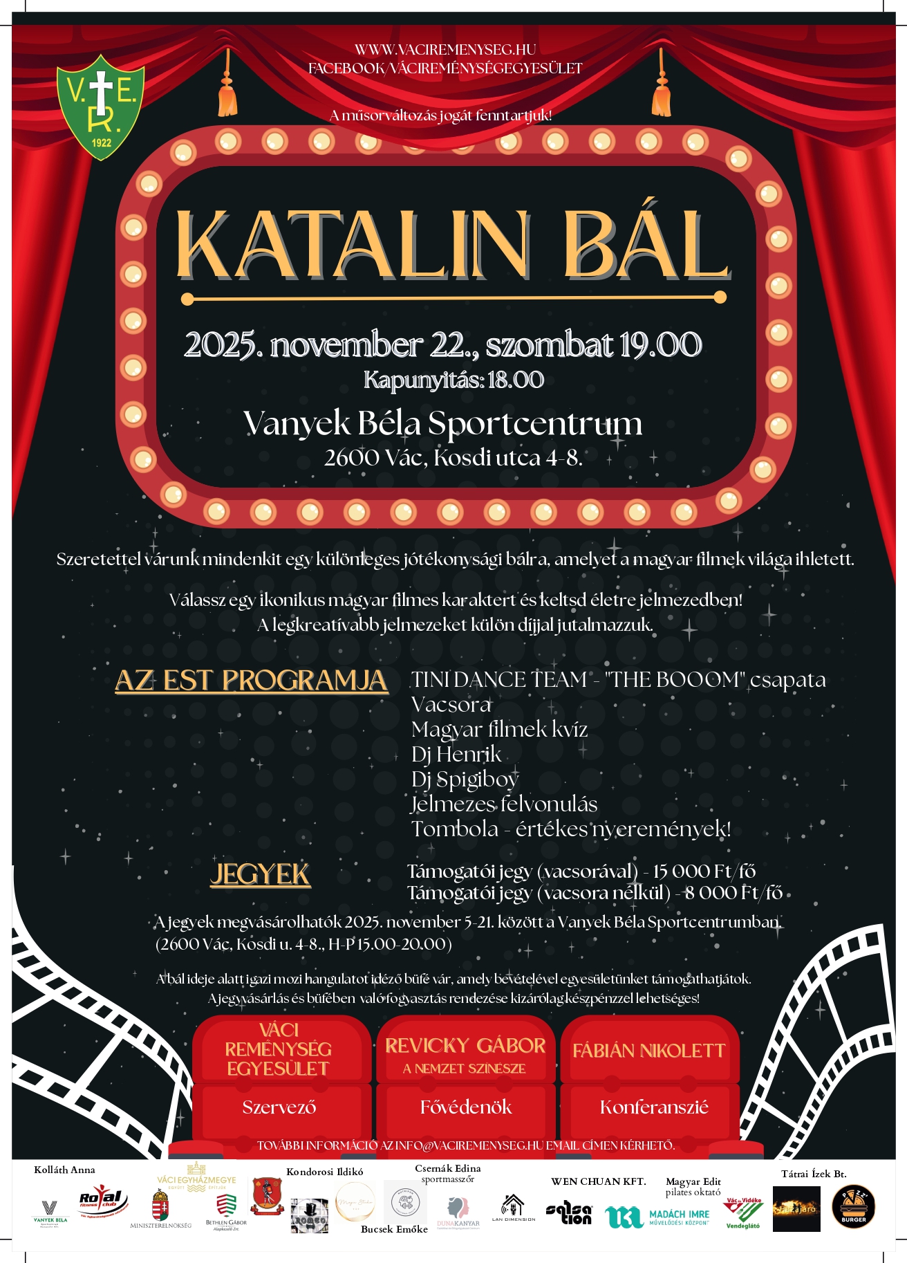 Külön megtiszteltetés, hogy Reviczky Gábor a Nemzet Színésze elfogadta felkérésünket és a bál fővédnökeként még személyesen is részt vesz az eseményen. A bálon lesz jelmezes beöltözés, a legkreatívabbakat díjazzuk, filmes kvíz játék keretén belül megismerkedünk a filmvilággal, zene, tánc.