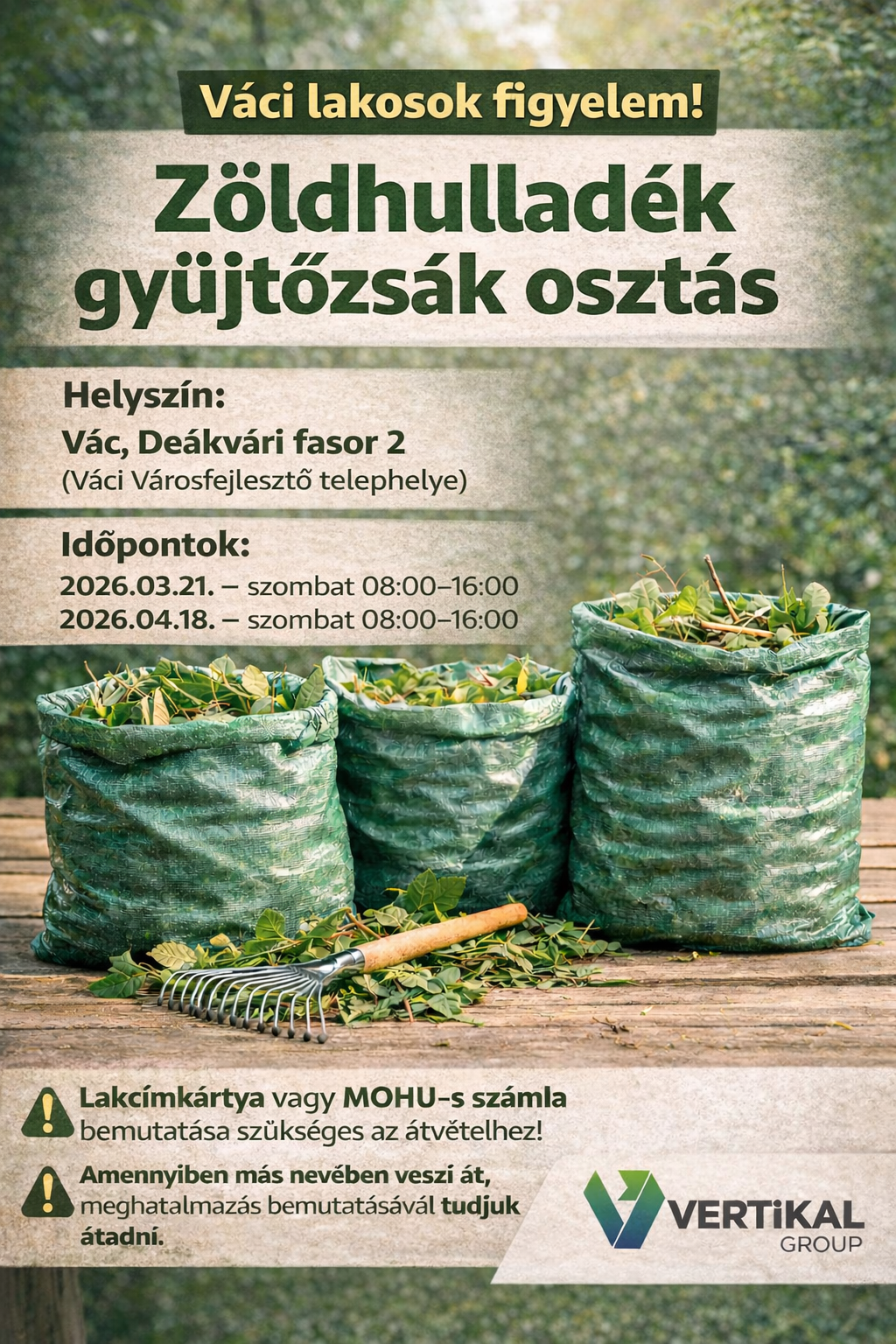 A hulladékszállítást végző VERTIKAL Group a korábbiaktól eltérően két napon osztja ki a zöldhulladék gyűjtőzsákokat. Családi házanként, illetve társasházak esetén lépcsőházanként 32 darab zsák jár ingyenesen a lakosok számára. A gyűjtőzsákok átvételéhez lakcímkártya és személyi igazolvány felmutatása szükséges.