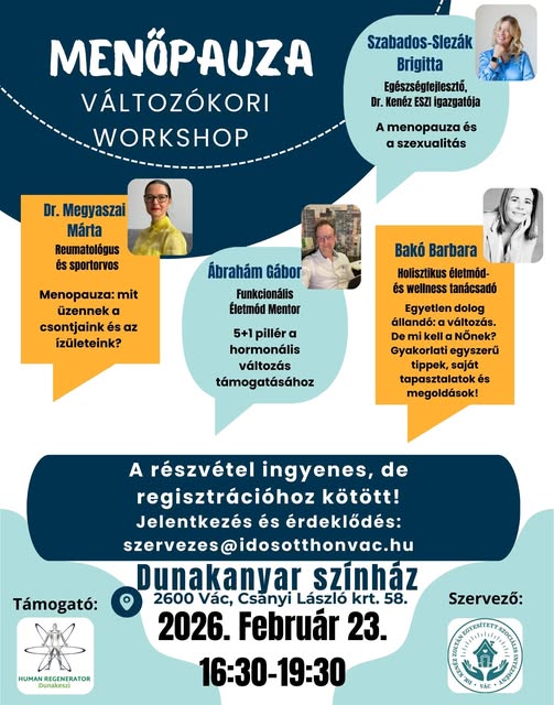 Az ingyenes, de regisztrációhoz kötött programnak a Váci Dunakanyar Színház ad otthont, ahol 16:30 és 19:30 között elismert szakemberek segítenek eligazodni a változókor összetett folyamataiban.