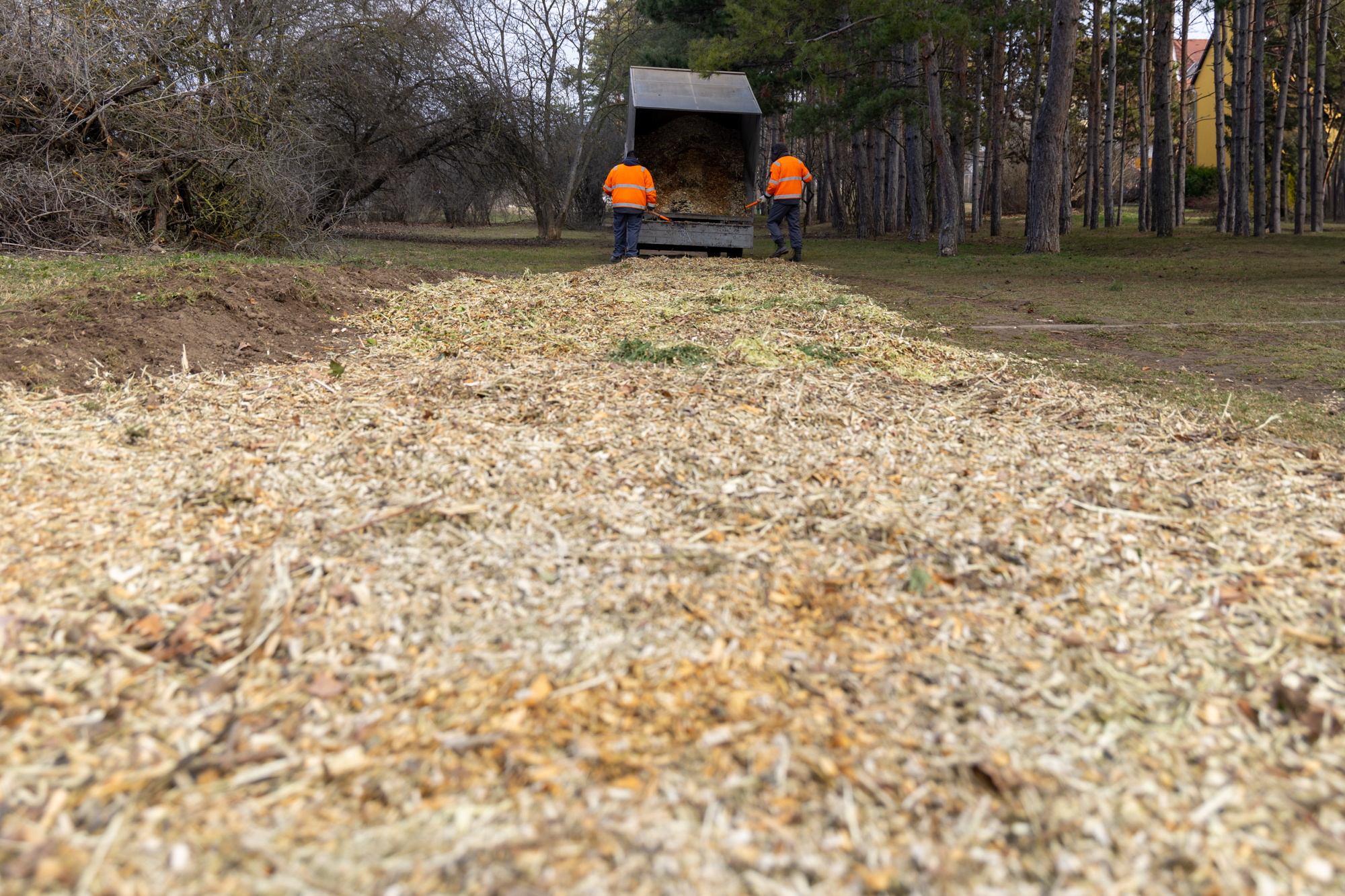 A mulcsot a 2021-ben vásárolt ágdaráló segítségével állítják elő. Rozmaring Sándor elmondta: a leterített faforgács egyrészt környezetbarát, másrészt a víz is átszivárog rajta, nem fog kijáródni, így gödrök, kátyúk sem keletkeznek, amiben az esővíz összegyűlhetne. Az alpolgármester hozzátette: a parkban sok az elöregedett, kevésbé kapaszkodó fenyőfa, amelyek könnyen kifordulnak egy erősebb viharban. A jövőben arra fognak fókuszálni, hogy ezeket a növényeket pótolják.