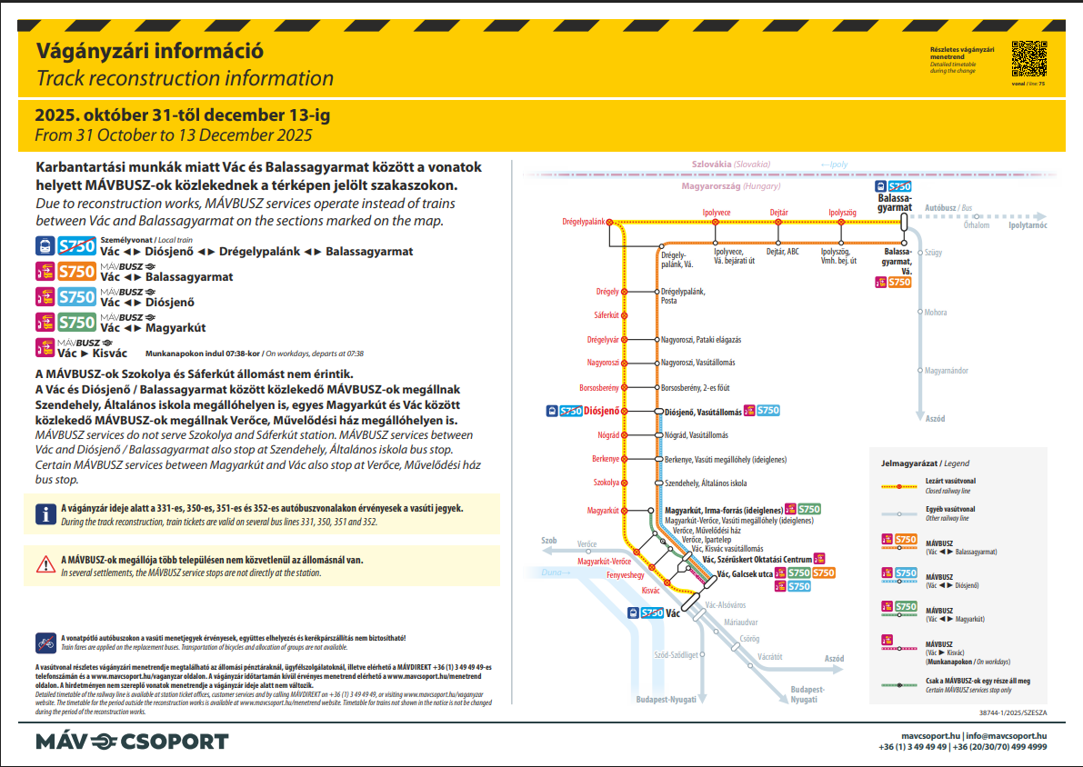 A Vác–Drégelypalánk–Balassagyarmat vonalon október 31-től szünetel a vonatforgalom, a teljes vonalon pótlóbuszok szállítják az S750-es vonatok utasait. A komplex felújítás Vác és Szokolya között összesen 7 kilométernyi vágányt érint: 14 ezer vasbetonaljat építünk be, 14 kilométernyi sínt cserélünk, javítunk 10 ezer sínfuratot, átépítünk 5 közúti-vasúti átjárót, továbbá nagygépes vágányszabályozást is végzünk. A Szokolya és Balassagyarmat közötti szakaszra a mérési eredmények figyelembe vételével határozzuk meg pontosan az emelt szintű karbantartás helyszíneit és feladatait.