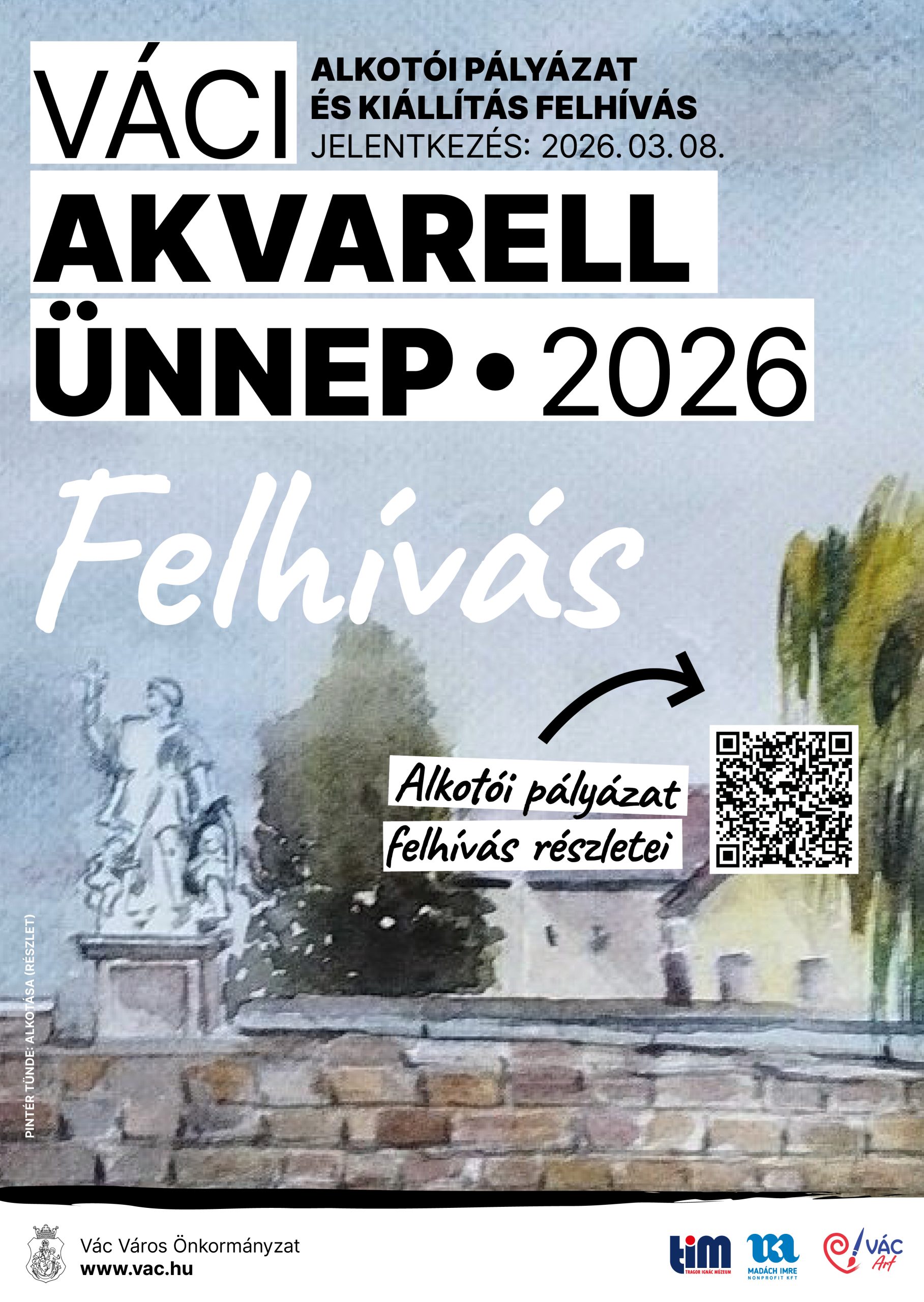 A Váci Akvarell Ünnep – 2026, a Madách Imre Művelődési Központ, valamint a Tragor Ignác Múzeum szakmai együttműködésével nyílt akvarell festménypályázatot hirdet „Vác és környéke metszetekben” címmel. A pályázatra amatőr alkotók jelentkezését várjuk, akik akvarelljeiken keresztül szeretnék megmutatni Vác és térségének hangulatát: a város és a természet találkozását, a Duna-part változó fényeit, a Naszály vonulatát, utcák, terek, kertek, ligetek csendes történeteit. A pályaművek lehetnek konkrét látványok, emlékek vagy benyomások, de születhetnek szimbolikus, hangulati vagy álomszerű víziók is – az akvarell technika sajátos könnyedségéhez igazodva.